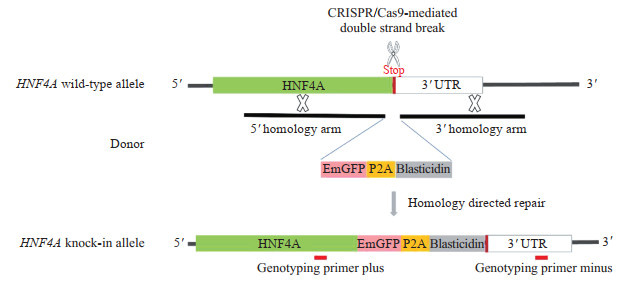 本研究通过CRISPR/Cas9技术构建了HNF4α-EmGFP-P2A-blasticidin报告hESC细胞系,基本构建策略是针对HNF4A基因TAG终止密码子附近位置设计gRNA,并以此位置设计上下游同源臂,构建包含EmGFP-P2A-blasticidin报告基因的供体质粒载体。其中EmGFP与内源HNF4A基因融合表达,blasticidin抗性基因通过P2A自剪切肽与HNF4α-EmGFP相连。如图 1所示。