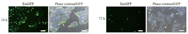 Strong GFP expression was observed in the hESC cultured for 24 h, which markedly diminished by 72 h. Arrows indicate EmGFP-expressing areas. Scale bar=100 μm. hESC: Human embryonic stem cell; EmGFP: Emerald green fluorescent protein.