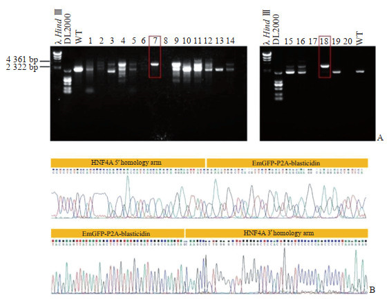 A: Agarose gel electrophoresis analysis of polymerase chain reaction products amplified from genomic DNA of transfected hESC. λ Hind Ⅲ is a DNA molecular weight marker. DL2000 is a commonly used DNA marker with a band size range covering 2 000 bpand below. Lanes labeled "WT" represent wild-type samples. Lanes 1-20 represent candidate clones, among which lanes 7 and 18 (highlighted with red boxes) correspond to homozygous edited clones. B: Sanger sequencing chromatogram and corresponding nucleotide sequence spanning the junction regions of the knock-in site. HNF4A: Hepatocyte nuclear factor 4 alpha; EmGFP: Emerald green fluorescent protein.