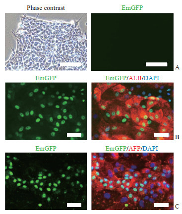 将筛选得到的HNF4α-EmGFP-P2A-blasticidin细胞系(7号克隆)进行诱导分化培养。HNF4α-EmGFP-P2A-blasticidin报告hESC细胞在诱导前无绿色荧光(图 4A),但在向肝细胞诱导分化25 d后部分细胞有明显的核定位绿色荧光,且这些细胞共表达肝细胞标志分子白蛋白(图 4B)和甲胎蛋白(图 4C)。上述结果证实本实验成功构建了HNF4A-EmGFP-blasticidin报告hESC细胞系,EmGFP报告基因可以示踪hESC向肝细胞分化过程。