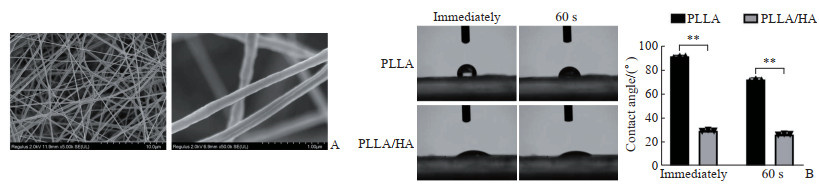 A: Scanning electron microscopic images of PLLA membrane; B: Water contact angle measurement showing enhanced hydrophilicity of PLLA/HA membrane immediately and 60 s after HA dip-coating modification. **P < 0.01. n=3, x±s. PLLA: Poly(L-lactic acid); HA: Hyaluronic acid.