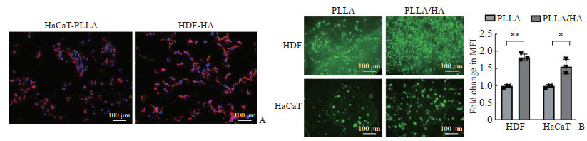 图 3 PLLA/HA支架上构建的组织工程皮肤形态及细胞黏附增殖情况Fig. 3 Morphology and cell adhesion/proliferation of tissue-engineered skin constructed on PLLA/HA scaffoldA: Phalloidin cytoskeleton staining of HaCaT cells on PLLA side (HaCaT-PLLA) of PLLA/HA membrane and HDF on the HA side (HDF-HA); B: Live/dead staining showing cell growth on PLLA and PLLA/HA membranes. *P < 0.05, **P < 0.01. n=3, x±s. PLLA: Poly(L-lactic acid); HA: Hyaluronic acid; HDF: Human dermal fibroblast; MFI: Mean fluorescence intensity.为进一步验证HA引入是否促进细胞生长,将HaCaT细胞和HDF分别接种于PLLA膜和PLLA/HA膜的HA侧,培养至第3天后进行活/死细胞双染色。结果显示,PLLA/HA膜组接种HaCaT细胞与HDF后绿色荧光信号强,细胞密度高,状态饱满;而在PLLA膜组中,绿色荧光信号明显弱于PLLA/HA膜组(均P<0.05,图 3B)。结果表明,HA的引入有助于改善支架表面生物环境,从而显著提升不同类型皮肤细胞的活性与增殖能力。