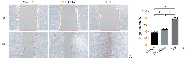 图 4 PLLA/HA膜和TES模型对HaCaT细胞划痕愈合的促进作用Fig. 4 Promotion effects of PLLA/HA membrane and TES model on HaCaT cell wound healingA: Microscopic images of scratch wounds at 0 h and 24 h; B: Quantitative analysis of cell migration rate. *P < 0.05, **P < 0.01. n=3, x±s. PLLA: Poly(L-lactic acid); HA: Hyaluronic acid; TES: Tissue-engineered skin.3 讨论