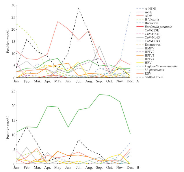 A: Outpatient influenza-like cases; B: Inpatient severe acute respiratory infection cases. A-H1N1: Influenza A (H1N1) virus; A-H3: Influenza A (H3N2) virus; ADV: Adenovirus; B-Victoria: Influenza B Victoria lineage; CoV-229E: Human coronavirus 229E; CoV-HKU1: Human coronavirus HKU1; CoV-NL63: Human coronavirus NL63; CoV-OC43: Human coronavirus OC43; HMPV: Human metapneumovirus; HPIV2: Human parainfluenza virus type 2; HPIV3: Human parainfluenza virus type 3; HPIV4: Human parainfluenza virus type 4; HRV: Human rhinovirus; M. pneumonia: Mycoplasma pneumoniae; RSV: Respiratory syncytial virus; SARS-CoV-2: Severe acute respiratory syndrome coronavirus 2.