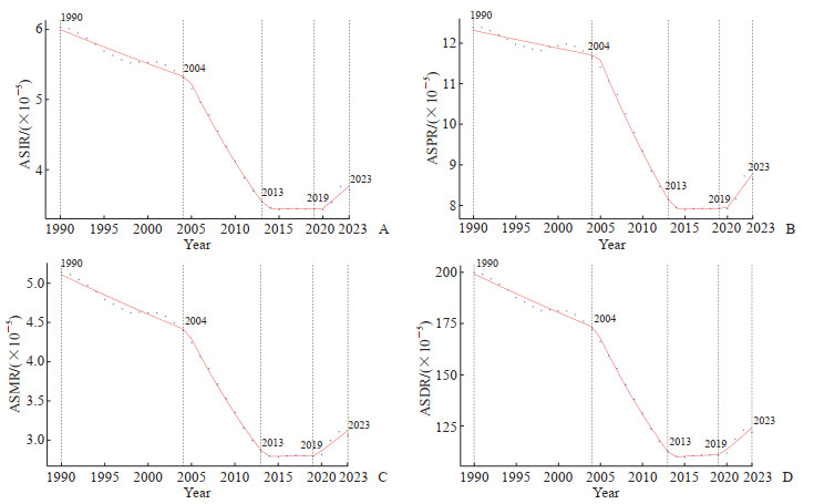 A: Joinpoint analysis of ASIR; B: Joinpoint analysis of ASPR; C: Joinpoint analysis of ASMR; D: Joinpoint analysis of ASDR. ASIR: Age-standardized incidence rate; ASPR: Age-standardized prevalence rate; ASMR: Age-standardized mortality rate; ASDR: Age-standardized disability-adjusted life year rate.