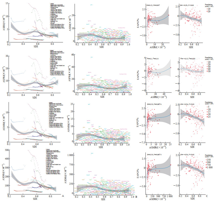 A: The correlations of ASIR, ASPR, ASMR, and ASDR with SDI in 21 GBD regions; B: The correlations of ASIR, ASPR, ASMR, and ASDR with SDI in 204 countries and territories; C: The correlations of EAPC of ASIR, ASPR, ASMR, and ASDR with SDI. SDI: Socio-demographic index; ASIR: Age-standardized incidence rate; ASPR: Age-standardized prevalence rate; ASMR: Age-standardized mortality rate; ASDR: Age-standardized disability-adjusted life year rate; EAPC: Estimated annual percentage change; GBD: Global Burden of Disease Study.
