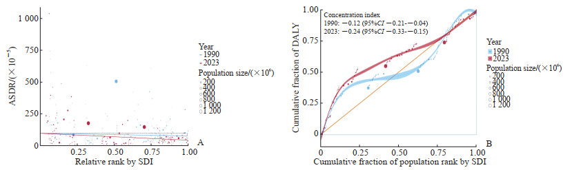 A: Slope index of inequality analysis; B: Concentration index analysis. ASDR: Age-standardized DALY rate; SDI: Socio-demographic index; 95%CI: 95% confidence interval; DALY: Disability-adjusted life year.