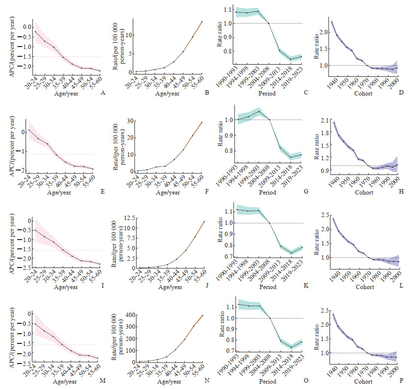 A: Net drifts & local drifts of incidence rates; B: Age effect of incidence rates; C: Period effect of incidence rates; D: Cohort effect of incidence rates; E: Net drifts & local drifts of prevalence rates; F: Age effect of prevalence rates; G: Period effect of prevalence rates; H: Cohort effect of prevalence rates; I: Net drifts & local drifts of mortality rates; J: Age effect of mortality rates; K: Period effect of mortality rates; L: Cohort effect of mortality rates; M: Net drifts & local drifts of DALY rates; N: Age effect of DALY rates; O: Period effect of DALY rates; P: Cohort effect of DALY rates. APC: Annual percentage change; DALY: Disability-adjusted life year.