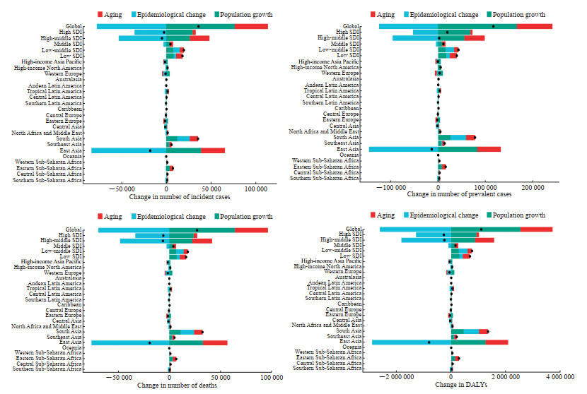 应用人口学分解法,将疾病负担变化分解为年龄结构、人口规模和流行病学变化的贡献,量化各因素的相对影响[7-8]。