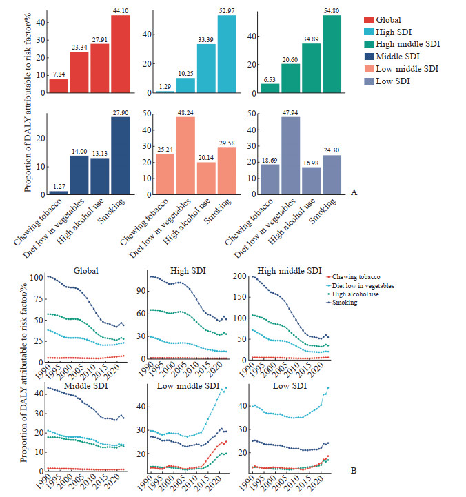 在可归因于全球20~60岁人群食管癌负担(DALY)的危险因素中,吸烟占44.1%,过量饮酒占27.91%,低蔬菜饮食占23.34%,嚼烟占7.84%。进一步分析显示,高、中高SDI地区20~60岁人群食管癌的危险因素归因顺位与全球总体趋势一致;而在中低、低SDI地区,低蔬菜饮食则成为该疾病的首要可归因危险因素(图 6A)。纵向趋势分析表明,各危险因素导致的20~60岁人群食管癌DALY均随时间呈下降态势,其中吸烟和过量饮酒相关DALY的降幅最为显著(图 6B)。