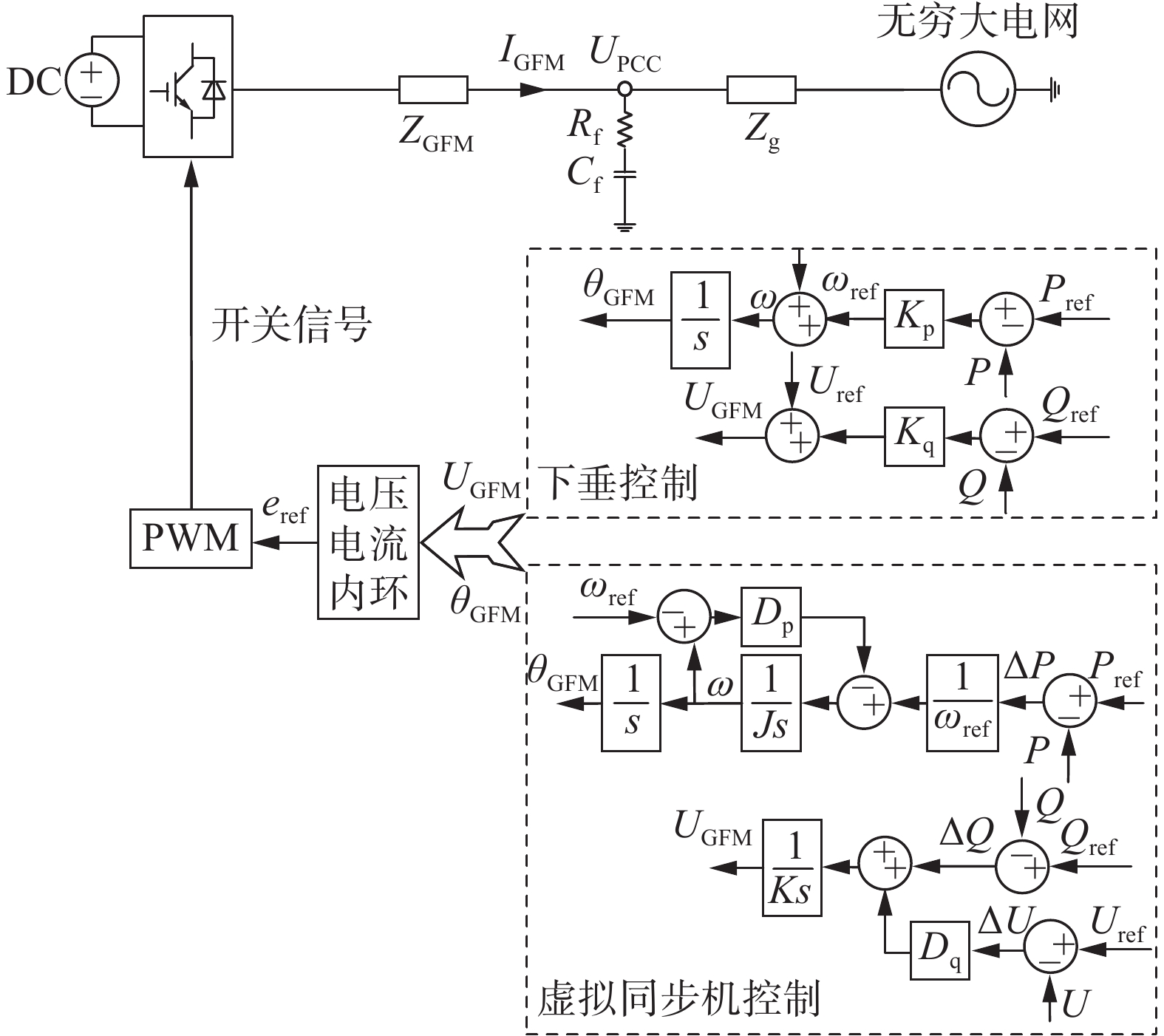 下垂控制和虚拟同步机控制的功率环控制结构如图1所示。图1中,ZGFM为构网型变流器等效内阻抗;IGFM为构网型变流器输出电流幅值;UPCC为并网点电压幅值;Zg为线路等效阻抗;Rf、Cf分别为滤波电阻和电容;eref为脉宽调制(pulse width modulation,PWM)控制信号;θGFM为变流器内电势的相角。