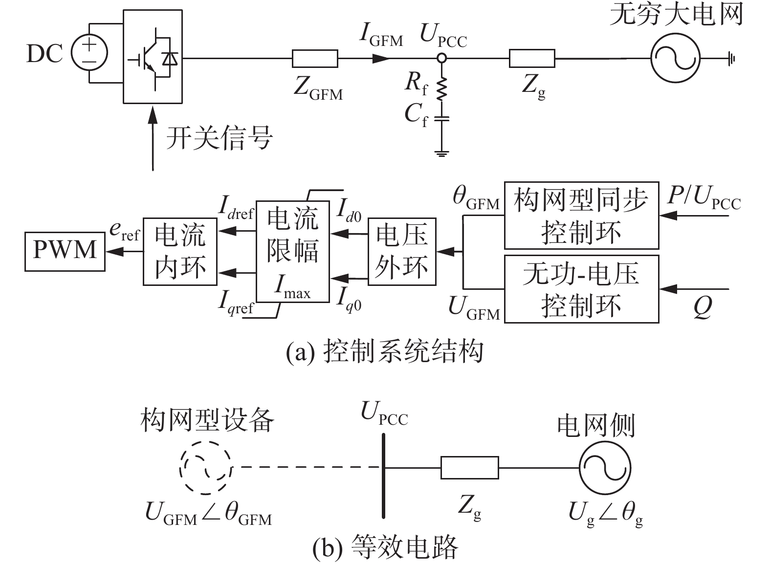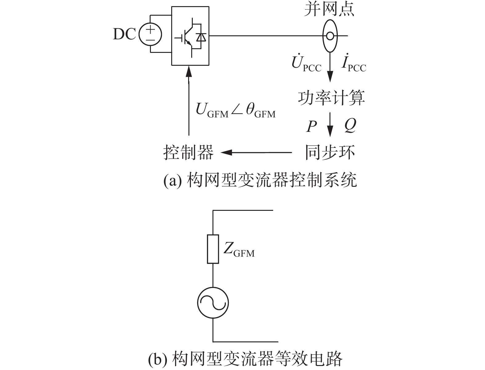 图 2 构网型变流器控制系统及等效电路 Fig. 2 Control system and equivalent circuit of grid-forming converters |