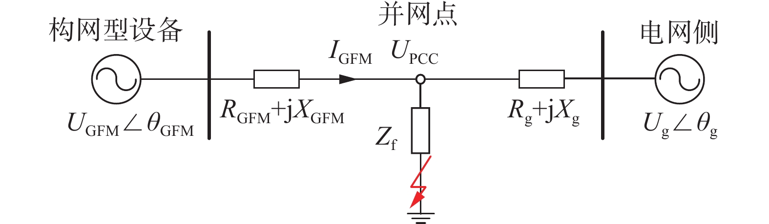 图3中,UGFM∠θGFM为构网型变流器内电势相量;RGFM+jXGFM为虚拟内电势到并网点的等效阻抗;Zf为短路阻抗;Rg+jXg为并网点与电网侧间的等效线路阻抗;Ug∠θg为电网电压相量。