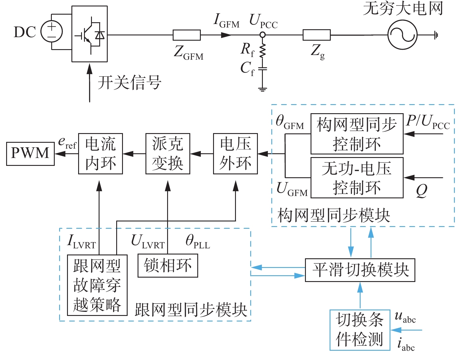 3.1 控制模式切换的原理切换至跟网型模式的暂态控制策略的基本原理是:稳态时构网型变流器采用功率同步或直流电压同步控制,当检测到网侧电压跌落至一定程度时,将构网型变流器切换为基于电流相量同步的跟网型控制模式,通过备用锁相环跟踪电网电压实现同步。切换模式后采用跟网型变流器的低电压穿越策略,暂态期间一般通过控制变流器有功和无功电流的指令值限制输出电流的幅值[32-33]。