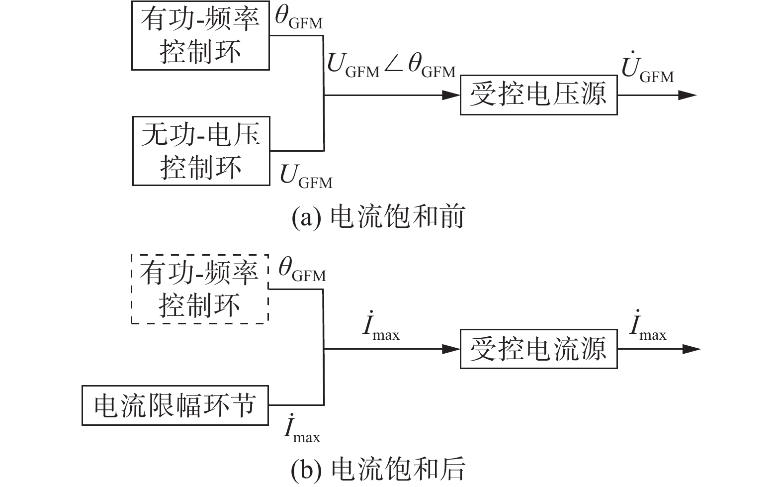 直接限制电流指令值的方法仅需在电流环指令入口处设置限幅环节,具有简单易实现的优势。但是当网侧电压发生深度跌落导致电流饱和时,构网型变流器将等效为输出电流幅值恒定的电流源,电压外环失去其控制作用,图8为电流未饱和与电流饱和时构网型变流器的运行状态,图中