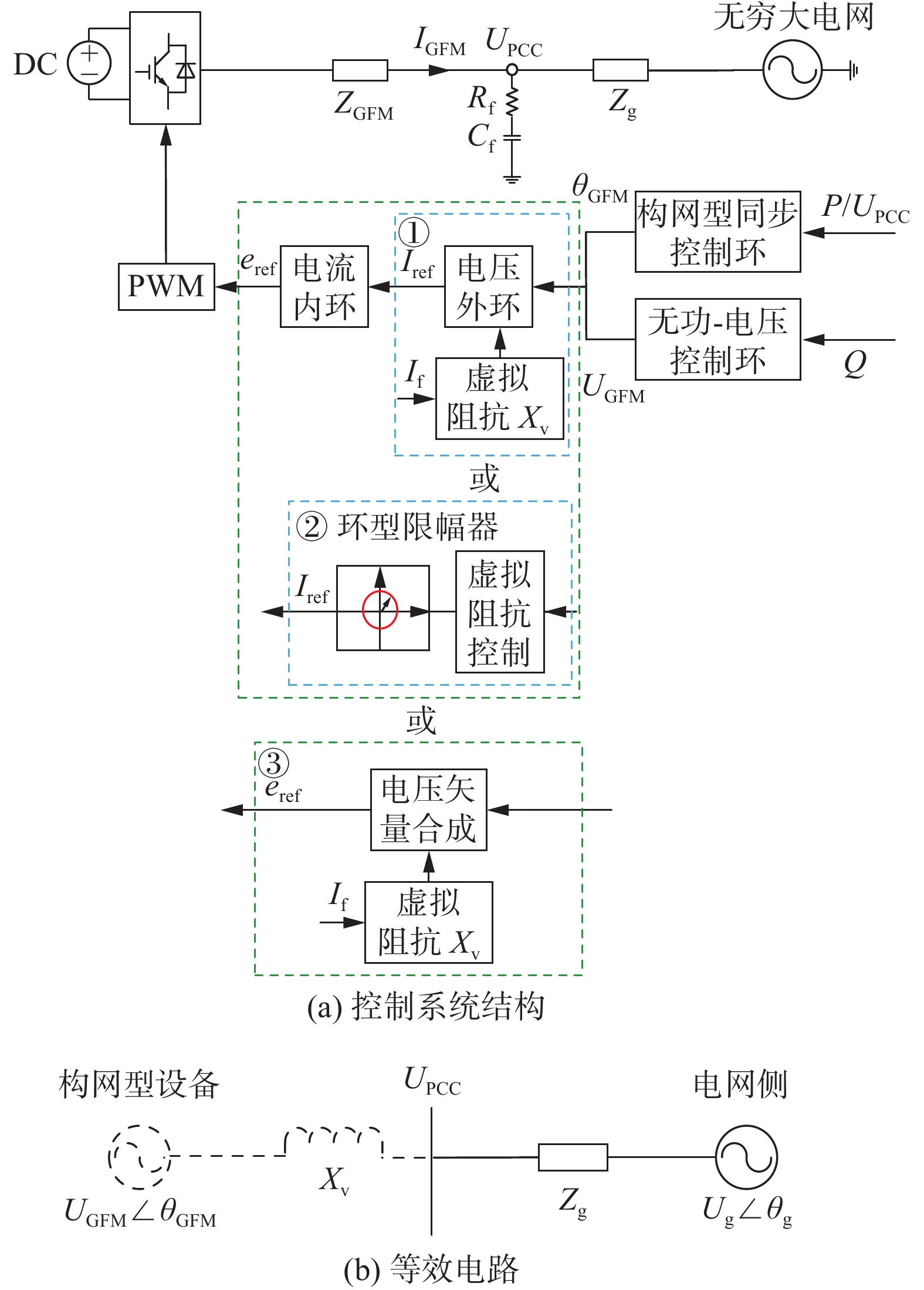目前实现虚拟阻抗限幅的方法主要包括两类,第一类方法是利用虚拟阻抗分担的压降限制输入电压环的电压指令值,进而间接限制输出电流指令值的幅值;第二类方法是通过修改故障期间虚拟阻抗的大小,对输出电流指令值进行限制,此类方法多用于采用虚拟阻抗代替电压内环的控制结构中,通常使用环形限幅器实现对电流指令值的限幅[54-55]。两类方法采用的限幅手段不同,但是原理均为等效增大构网型变流器的虚拟阻抗[17]。图9为采用虚拟阻抗限幅示意,其中虚线框内按序号依次为电压电流双环、虚拟阻抗和直接电压式控制结构。图9中,If为输入的虚拟电流;Iref为电流指令值。