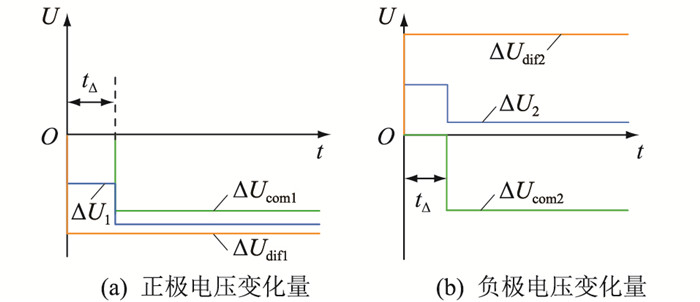 式中:ΔU1,ΔU2分别为正极、负极的电压变化量、ΔUcom1,ΔUcom2分别为正极、负极的电压共模分量变化量;ΔUdif1,ΔUdif2分别为正极、负极的电压差模分量变化量。
