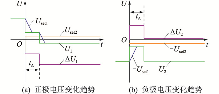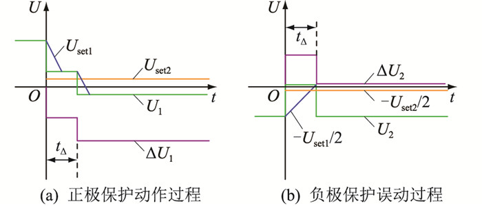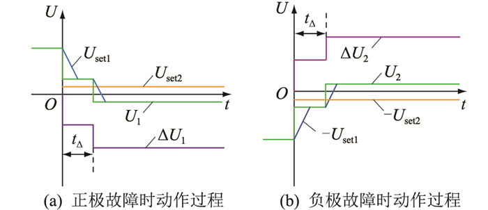 式中:Uset1,-Uset1分别为正极、负极在双阀组运行(电压±800 kV)时的电压变化速率定值;Uset2,-Uset2分别为正极、负极在双阀组运行(电压±800 kV)时的电压定值;tset为时间定值。当正极或负极处于单阀组运行(电压±400 kV)时,电压变化速率定值、电压定值分别为Uset1/2,-Uset1/2和Uset2/2,-Uset2/2。