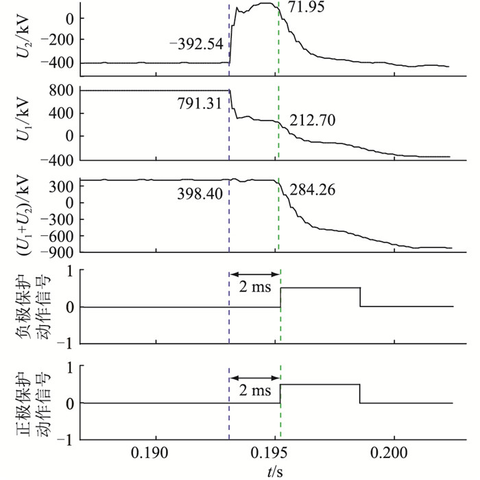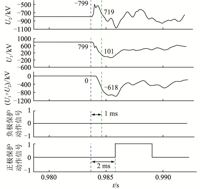 4.2 结果分析采用传统的电压突变量保护逻辑,特高压直流输电系统在双极四阀组工况下,正极F1故障点与保护测点之间的距离等于150 km时的波形如图 6所示。在正极故障瞬间,负极的电压从-799 kV变化至-500 kV之后在1 ms以内恢复。负极无论是电压下降的幅度,还是电压下降后持续的时间都没有达到电压突变量保护的定值,所以负极的电压突变量保护没有动作,符合2.3节的分析。