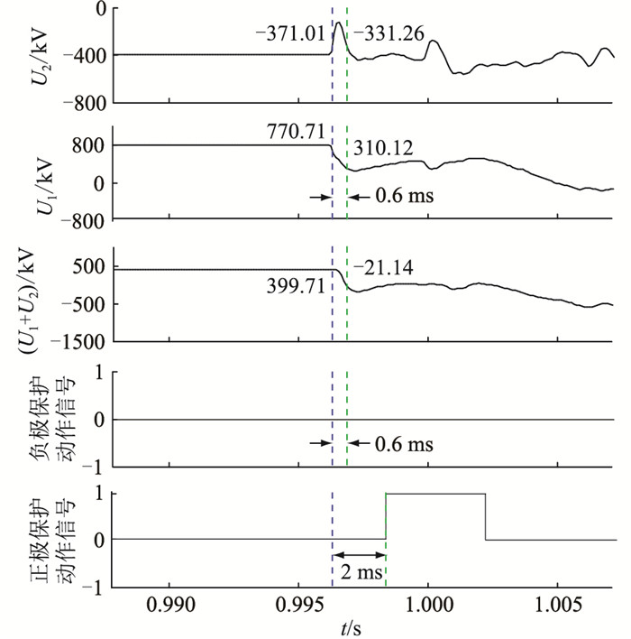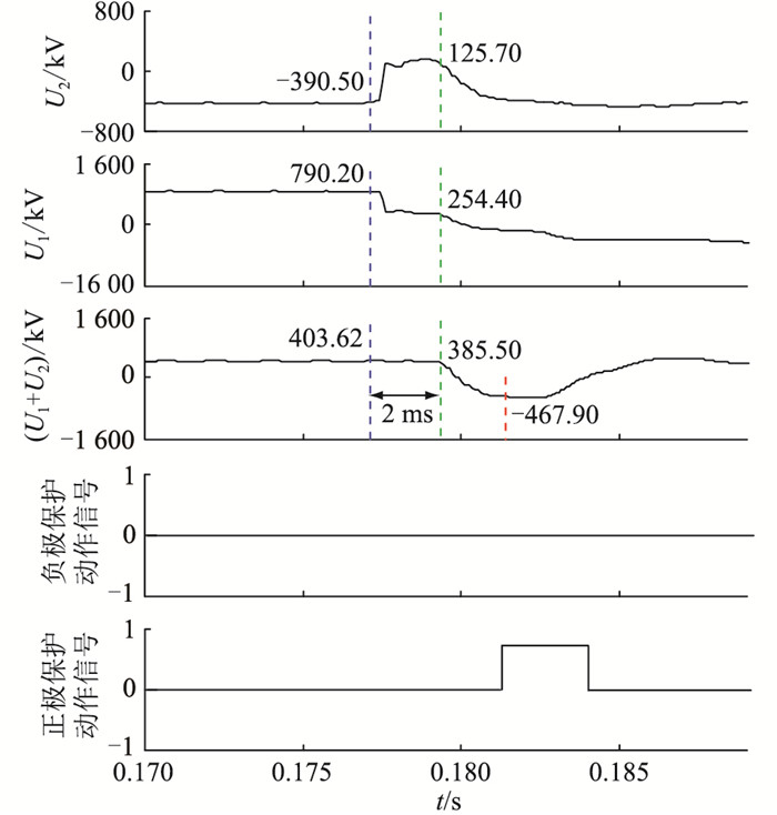 在正极故障瞬间,负极的电压从-371.01 kV开始变化,在0.6 ms以内恢复。负极电压下降的幅度虽然满足定值Uset2,但是电压下降后持续的时间没有达到电压突变量保护的时间定值tset,所以负极的电压突变量保护没有动作。