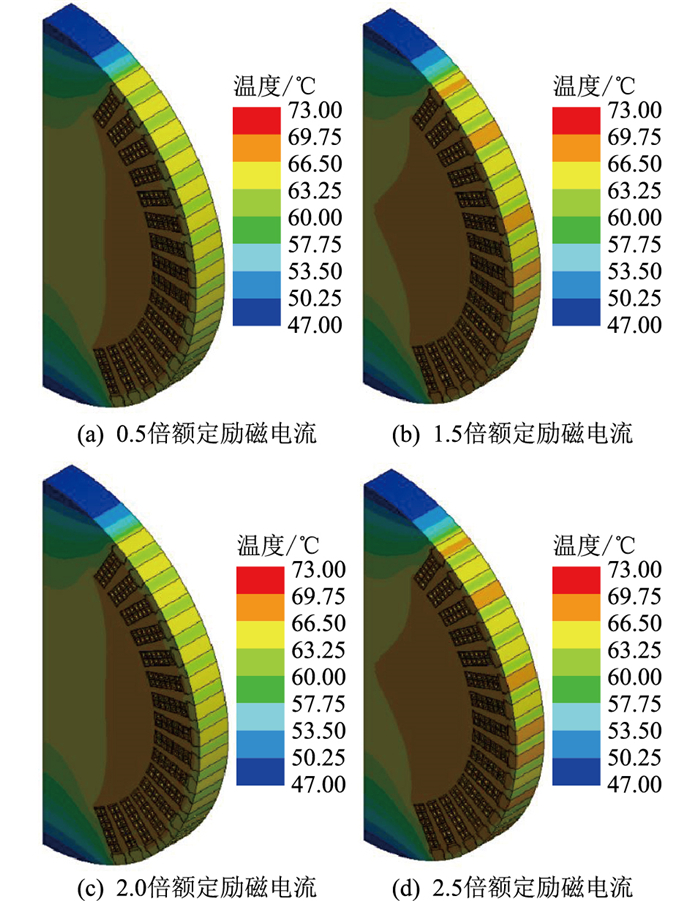 2.2 不同负荷下转子温度场分布文中选取0.5倍励磁电流、1.5倍励磁电流、2倍励磁电流、2.5倍励磁电流模拟同步调相机带不同负荷,并分析同步调相机不同负荷下的稳态温度场,如图 3所示。