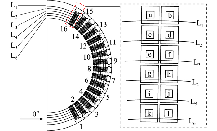为便于分析,对转子二分之一模型的16个槽进行编号,如图 4所示,并根据空心导线排列方式,以槽1位置为起点,以转子圆心为原点,共取L1、L2、L3、L4、L5、L6六条路径。为方便下文对转子空心导线堵塞情况下的温度场、热应力进行分析,对槽16内12个空心导线进行编号,依次取为a、b、c、d、e、f、g、h、i、j、k、l。
