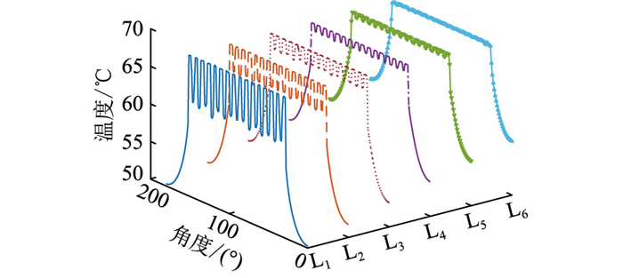 图 5为额定工况下不同路径的温度分布,由图中可知不同路径下温度分布相似,不同路径下的最高温度几乎相同,最低温度按L1(59 ℃)、L2(64 ℃)、L3(66 ℃)、L4(67 ℃)、L5(68 ℃)、L6(69 ℃)排列依次升高。这是由于靠近转子外表面的位置,励磁绕组容易通过绝缘—铁芯—空气、绝缘—槽楔—空气两种路径与气隙中的冷却空气换热,而且路径L1所穿过转子铁芯较长,因此不同槽之间的温度区分较为明显,最外侧L1温度变化较大。