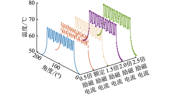 由于路径L1较其他路径有较为明显的温度区分度,因此选择路径L1比较不同工况下的温度分布差异。如图 6所示,0.5倍励磁电流下路径L1最低温度为58 ℃;额定励磁电流下路径L1最低温度为59 ℃;1.5倍励磁电流下路径L1最低温度为62 ℃;2倍励磁电流下路径L1最低温度为65 ℃;2.5倍励磁电流下路径L1最低温度为70 ℃。路径L1不同工况下的温度随励磁电流的增大而增大,与实际情况相符。