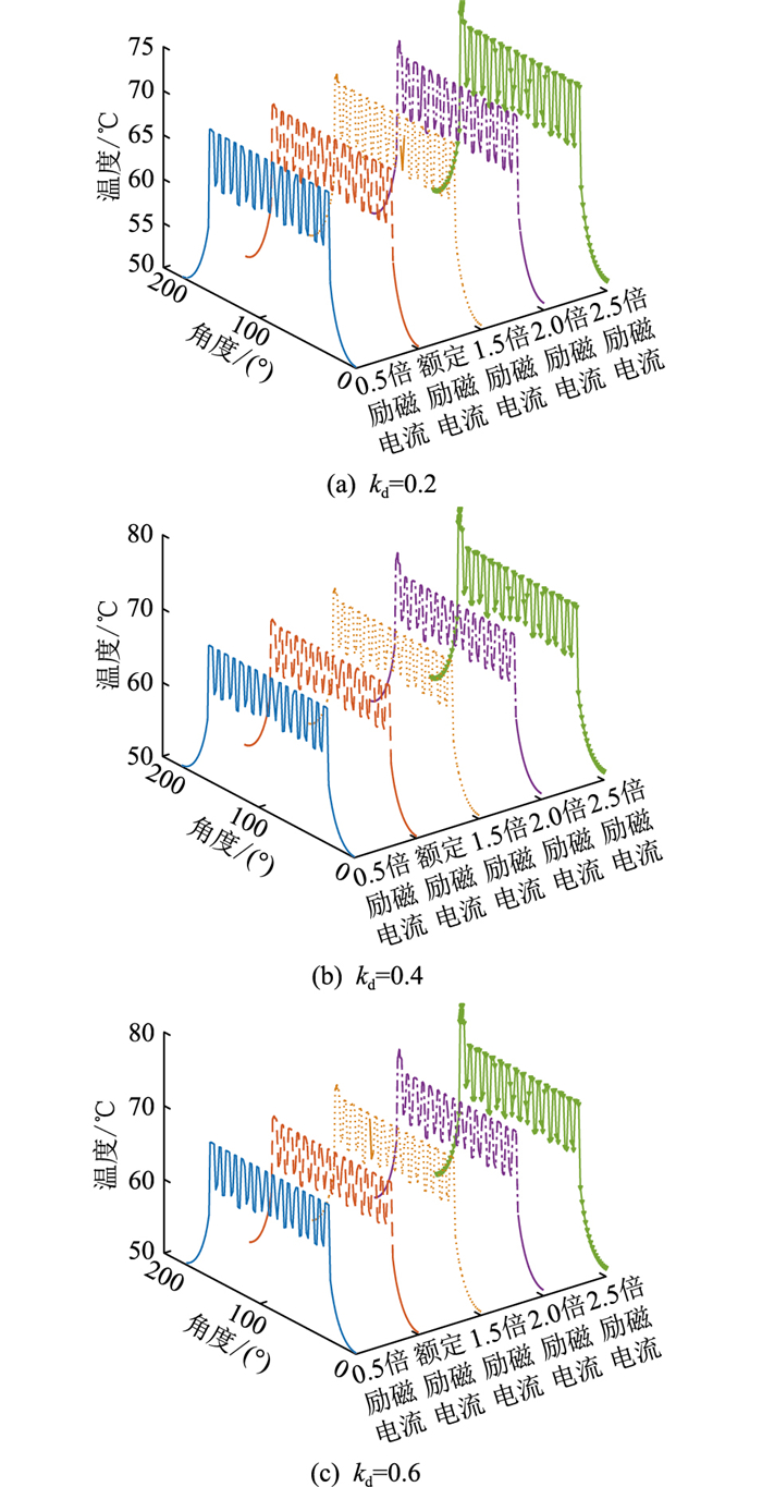 选取图 4中16号槽的a号空心导线,取堵塞系数kd(空心导线中被堵的截面积与正常空心导线通流截面积的比值)分别为0.2、0.4和0.6的情况下分析转子不同工况下的温度分布,得到不同堵塞系数下路径L1的仿真结果,如图 7所示。