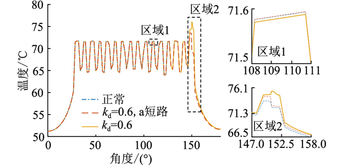 3.2 转子匝间短路及水路堵塞温度场分析由3.1节分析可知,同步调相机运行于过励磁条件下发生水路堵塞时局部温升最高,易引起转子匝间短路,此外3.2节进一步分析了转子发生水路堵塞且匝间短路时的温度场。图 8为2.5倍励磁电流正常情况、kd为0.6、kd为0.6且a处短路3种情况下的温度分布。图 9为不同槽发生5匝短路且a号空心导线kd为0.6时路径L1的温度分布。