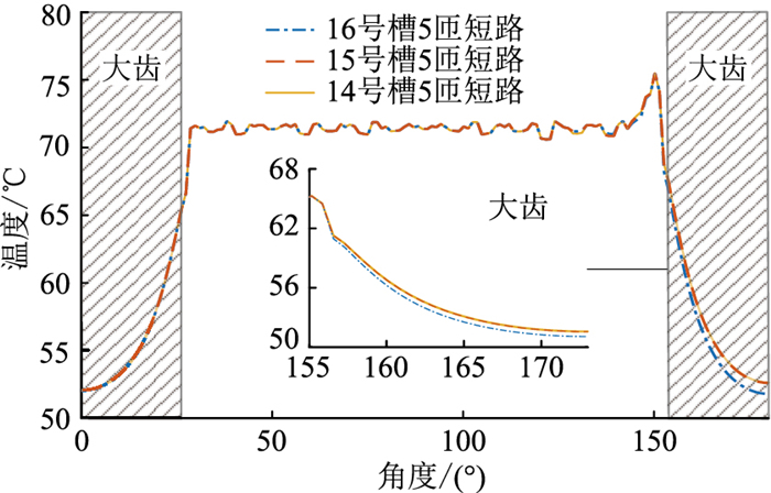 由图 9可知,转子匝间短路故障会引起转子温度畸变,且不同短路位置对转子温度分布影响不同,16号槽短路时转子大齿温度较14号、15号槽短路时温度低1 ℃。同步调相机转子不同槽发生短路程度相同的匝间短路时,由于正常导线在发生匝间短路后承受励磁电流高于故障前,因此路径L1故障后温度高于故障前温度且温度梯度变小,如图 9所示,整体温度被“拉平”。当匝间短路发生在与转子大齿最近的位置时,大齿温度最低。因此,不同位置的匝间短路对大齿温度影响不同,距大齿较近时大齿温度最低,随匝间短路所在槽与转子距离的增加,大齿温度缓慢升高。