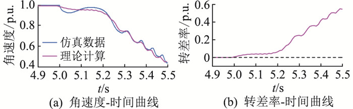 3.2 电机暂态稳定性判据仿真验证由3.1节可知,该永磁同步电机的临界失稳电压为0.6~0.7 p.u.,文中以0.01 p.u.作为步长在此电压暂降范围内进行理论计算,与仿真形成的角速度对比以及理论计算得到的转差率见图 4—图 6。