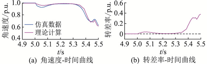 图 6 当U=0.63 p.u.时角速度与转差率曲线 Fig. 6 Angular velocity-time curve and slip-time curve at U=0.63 p.u. |