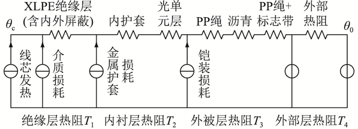 图 2 500 kV XLPE海底电缆等效稳态热路模型 Fig. 2 Equivalent steady state thermal circuit model of 500 kV XLPE submarine cable |