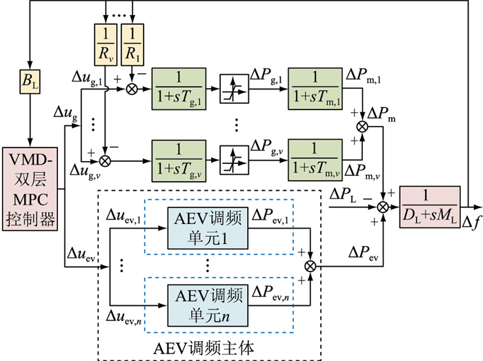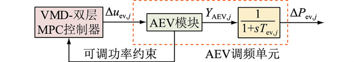 VMD-双层MPC控制器输出AEV调频单元j的控制指令Δuev, j,AEV模块接收到调频指令后,经底层控制器调节聚合模型输出功率YAEV, j来跟踪指令。与此同时,聚合模型更新各状态变量,计算下个时刻AEV的可调功率范围,并以此作为约束条件反馈给VMD-双层MPC控制器。为了便于