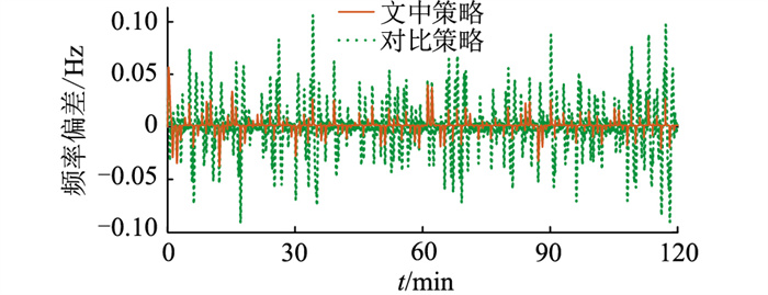 图 9给出了不同策略下传统机组出力对比结果。对比策略中机组出力变化剧烈,且变化幅度大、频率高,出现多次超调,不能维持机组出力平稳。而文中策略通过VMD重构低频分量,将其作为传统机组出力参考值,并采用双层MPC实现指令跟踪,使得传统机组出力更加平稳,变化趋势更加平缓,有利于传统机组在调频过程中的安全运行。