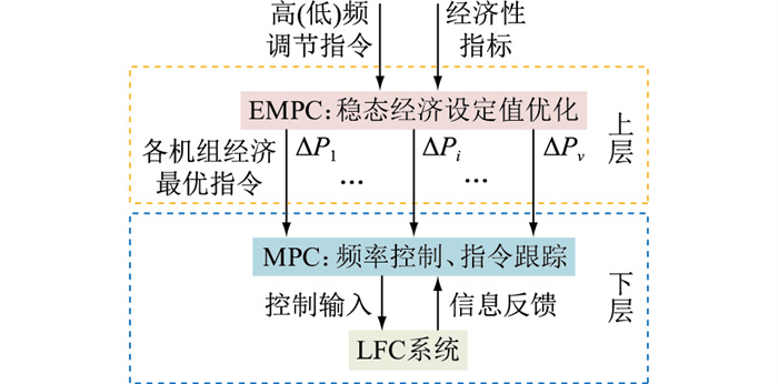 2.2 基于双层MPC的协同控制策略 2.2.1 双层MPC框架随着MPC技术的不断发展,MPC已从集中式MPC、分散式MPC、分布式MPC等传统单层控制结构逐步扩展为双层MPC结构[22],如图 3所示。上层结合各资源经济性指标及相关约束,通过EMPC将调频指令分解为各机组的最优跟踪指令ΔPi,实现稳态经济设定值的优化;下层则通过MPC实现动态频率优化控制,使区域频率波动恢复稳定并驱使各机组完成指令跟踪。双层MPC实现了经济优化与动态控制的逐级递进,有效兼顾了频率调节过程的经济性和良好的跟踪性能。