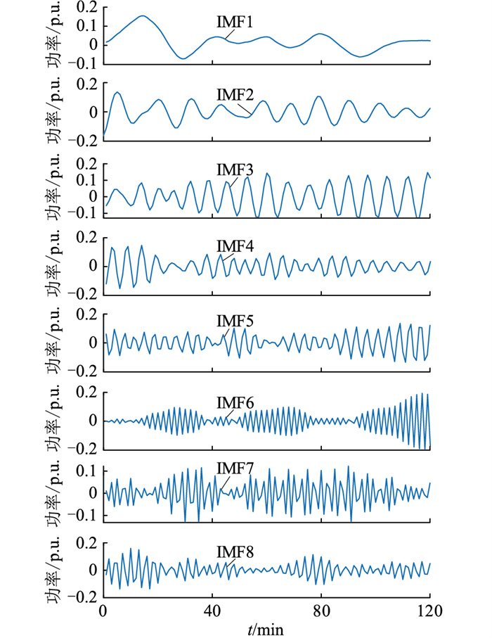 为使VMD后各IMF分量的中心频率不重叠,且Z值尽可能小[21],经多次试验,最终选取VMD算法分解参数Z=8。分解后各子分量如图 6所示。可见,经VMD后,原始调频指令被分解为8个频率由低到高的IMF分量。在本系统中,根据传统机组以及AEV调频主体的可调功率范围,将前4个分量IMF1—IMF4重构形成低频火电机组响应指令,后4个分量IMF5—IMF8重构形成高频AEV调频主体响应指令。
