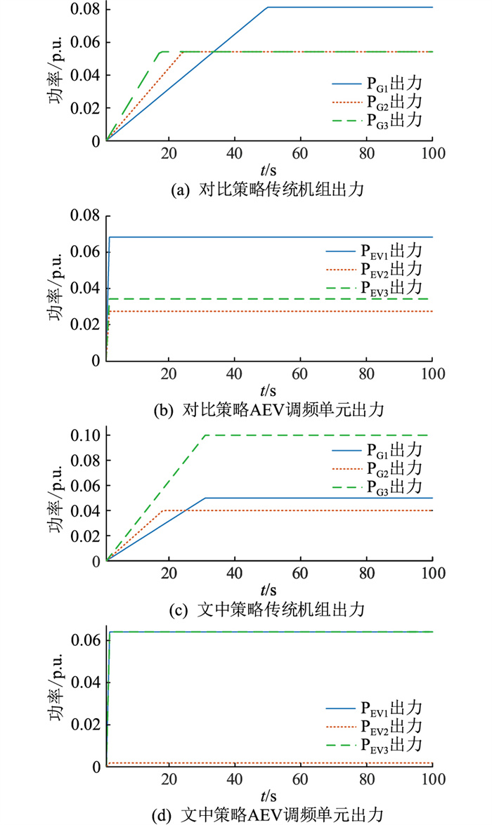 为体现文中所提双层MPC策略在指令再分配与调节过程中的经济性与动态性能,将其与文献[26]中按可调容量比例分配的控制策略进行对比分析。图 7给出了不同控制策略下传统机组与AEV调频单元出力的对比结果。分析结果可知,所提控制策略与对比策略均可准确响应传统机组0.19 p.u.与AEV调频主体0.13 p.u.的调频指令,但各机组出力情况差异较大。这是因为对比策略仅依靠可调功率比例分配,而文中策略在指令再分配层中考虑了各资源调节的经济性以及传统机组的爬坡率,并在约束条件中限制了可调功率范围,使各资源在不超出可调范围的前提下获得更优的调频指令。在调节成本上,文中策略和对比策略分别为22 014.9元和22 883.2元;在最大爬坡时间上,文中策略和对比策略分别为30.0 s和48.6 s。由此可见,文中策略减少了整个频率调节过程的成本,缩短了传统机组最大爬坡时间。