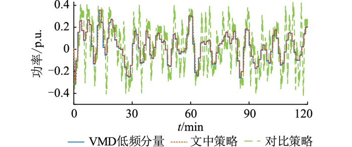 为研究文中提出的VMD- 双层MPC控制策略对频率调节动态特性的影响以及对传统机组出力的优化,根据图 5所示的连续调频指令进行仿真,取参数zl=4,并与传统的比例积分(proportional integral, PI)控制策略进行对比分析。