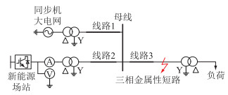 为验证第1章中新能源机端电压-短路电流幅相映射模型的准确性,在PSCAD仿真软件中搭建如图 3所示的简易电网模型。该模型中参数设置为:同步机大电网端口电压为121 kV;线路1、2、3阻抗参数均为0.1+j0.4 Ω/km;线路1、3长度之和为16 km;线路2长度为1 km;负荷大小为120+j60 MV ·A。新能源支路变压器为理想变压器,Dyn接线,其变比及额定容量分别为38.5 kV/121 kV、150 MV ·A。新能源机组参数可参考文献[26]。