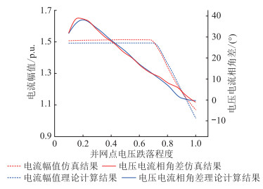 为进一步验证上述理论计算值的精确性,在PSCAD中将图 1所示模型(模型设置同理论计算)接入图 3所示模型中的新能源并网点,同样通过逐次改变线路1、3的长度比例调节并网点电压的跌落程度,并记录对应的并网点电流幅值及电压电流相角差。最后,将PSCAD仿真结果与Matlab理论计算结果绘入同一坐标系,如图 5所示。由图 5对比分析可知,并网点电流幅值、电压电流相角差的理论计算结果与仿真结果吻合程度较高,验证了理论计算结果的准确性。