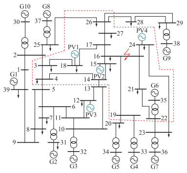 将所得改进的新能源并网点幅相映射模型应用于大电网级短路电流计算,对所提改进方法的有效性和精确度进行相应验证。为此,在PSCAD软件中搭建如图 6所示的IEEE 39节点系统模型。出于简便性考虑,将3.2节中新能源并网系统模型分别接入节点18、15、12、24所在母线,分别为PV1、PV2、PV3、PV4,并设置在节点16处发生三相对称接地故障。