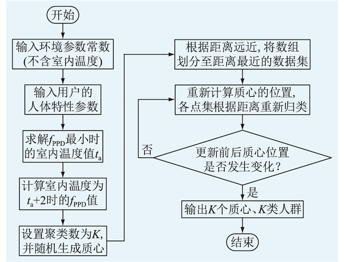 2 人群划分 2.1 用户差异化的PPD聚类方法用户能量代谢率和服装热阻的不同, 会导致其热忍受能力存在差异。故文中基于PPD中的独立人体参数,将具有相似热忍受能力特征的用户聚集成新的用户群,再对其进行调度。