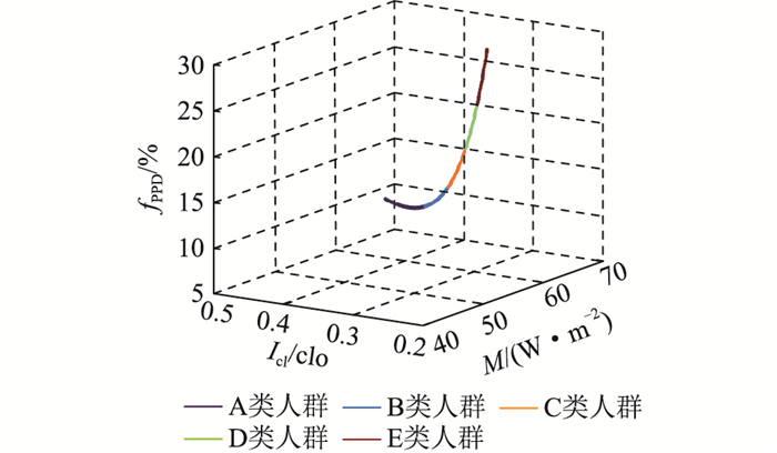 人群划分结果如图 2所示,用户被划分为具有不同热忍受能力特征的5类群体,即A类—E类。fPPD值越小说明该类人群对温度变化越不敏感,热忍受能力越强。故A类人群的热忍受能力是最强的,而E类人群的热忍受能力是最弱的,即由A到E,热忍受能力由强到弱。