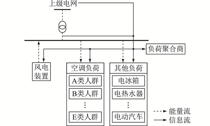 在第2章的基础上,文中提出一种基于用户差异化热舒适度的空调DLC策略。在微网系统中,负荷聚合商通过通信网络将风电装置、空调负荷和其他负荷进行连接。负荷聚合商在获取需要消纳的风电资源信息后,会下达指令给空调负荷和其他负荷。空调负荷和其他负荷将共同出力,消纳系统中的风电资源。微网调度结构示意如图 3所示。