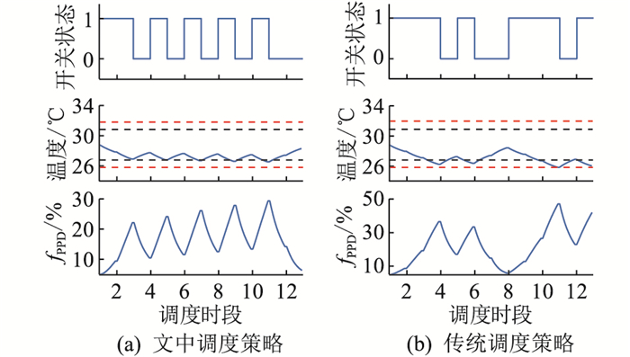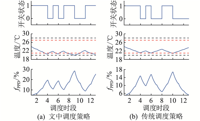 传统调度策略无法量化每类人群的热舒适体验,故每类人群中的空调机组运行温度区间跨度均相同。由图 6可知,对于热忍受能力相对较强的用户群体而言,其机组在调度过程中室内温度只要低于红色温度区间下界,就须关闭升温、停止出力,但此时仍处于热舒适温度区间内部。而对于热忍受能力相对较弱的用户群体而言,如图 7所示,其机组在调度过程中室内温度已经超出了热舒适温度区间,但传统调度策略仍对其进行调控,导致其fPPD值超出舒适阈值。由此可知,传统调度策略无法挖掘热忍受能力相对较强的用户群体的调度潜力,且无法保障热忍受能力相对较弱的用户群体的热舒适性。而文中所提策略引入热舒适度模型,量化了每类人群在调度过程中的热舒适体验,增强对热忍受能力强的用户群体的调控力度,降低对热忍受能力弱的用户群体的调控力度,挖掘了每类人群的调度潜力。由图 6可知,在文中调度策略下,A类人群机组多出力了2个调度时段;而由图 7可知,在文中策略下,E类人群机组少出力了2个调度时段。且在调度过程中,2类人群中的机组均未超出舒适阈值,有效保证了其调度过程中的热舒适性。