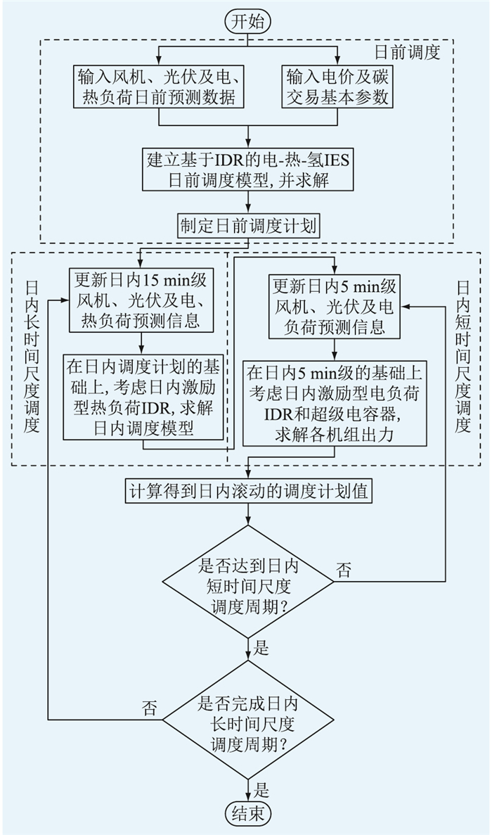 具体步骤如下。步骤1:输入初始数据。步骤2:建立电-热-氢各能源设备模型和需求响应模型。步骤3:基于日前电、热IDR,以IES日前综合成本最低为目标,制定24 h的日前机组出力计划以及用能计划。步骤4:依据日前计划,以15 min为时间尺度,在日内时段,根据日内更新的风电、光伏的出力以及负荷等预测信息,以日内长时间尺度内运行成本最低为目标,通过调整各设备出力和激励型热负荷需求响应平抑各能源功率波动。步骤5:短时间尺度调整与长时间尺度嵌套执行,只在每个5 min开始时,根据日内5 min级的预测信息,通过调整购电功率、引入超级电容器和激励型电负荷需求响应进一步对时长较短的电功率波动进行平抑,确定调整后的最终调度计划值。