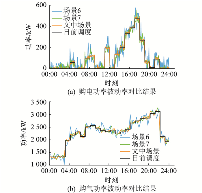 结合表 4和图 10可知,相比场景6,场景7的IES总成本和碳排放总量分别下降1.76%和7.54%,且购电、购气功率波动率分别下降7.68%和7.93%。这是由于场景7的日内双时间尺度调度策略能通过调整各个能源设备的输出功率来平抑系统功率波动,平抑预测误差带来的功率波动。而场景6则是完全通过调整购电、购气功率来平抑系统的功率波动,因此在平抑过程中产生大量的购电、购气功率波动,导致IES的购电成本和购气成本大大增加,使IES的总成本和碳排放总量上升。