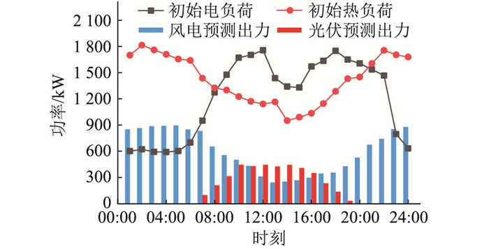 4 算例分析 4.1 算例参数以某电-热-氢IES为对象进行算例分析,其结构如图 2所示。该IES内部的电、热负荷以及风电、光伏预测数据曲线如图 3所示。IES内各能源设备参数见表 2。分时电价中谷时段为23:00—06:00;平时段为06:00—09:00、13:00—17:00;峰时段为09:00—13:00、17:00—23:00;Tminin和Tmaxin分别为15 ℃和24 ℃,典型日室外温度参考文献[21];日内调度中预测数据由日前预测数据及其预测误差分布生成,其各部分不确定性水平参考文献[13];日内电、热负荷削减率φt与φs均取5%;激励型IDR中负荷补贴系数αe、αh, 1、αh, 2分别为0.04、0.03、0.05;日内设备调整惩罚系数可参考文献[22]。